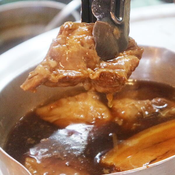 ■三枚肉は、豚バラ肉を6時間以上煮込み、余分な脂を落としてあっさり仕上げ。